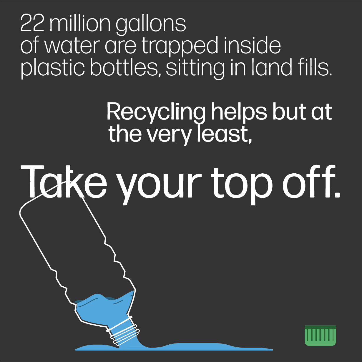 The Take Your Top Off Public Awareness Campaign (PAC) has the goal to reach all Houstonians to learn how they can take part in building a more sustain-able and resilient Houston. Issues surrounding the disposal of plastic water bottles with the tops still on affect the whole world and Houston has the unique opportunity to lead this movement. The campaign consist of two major visibility components: an augmented reality enhanced poster, and a social media presence.