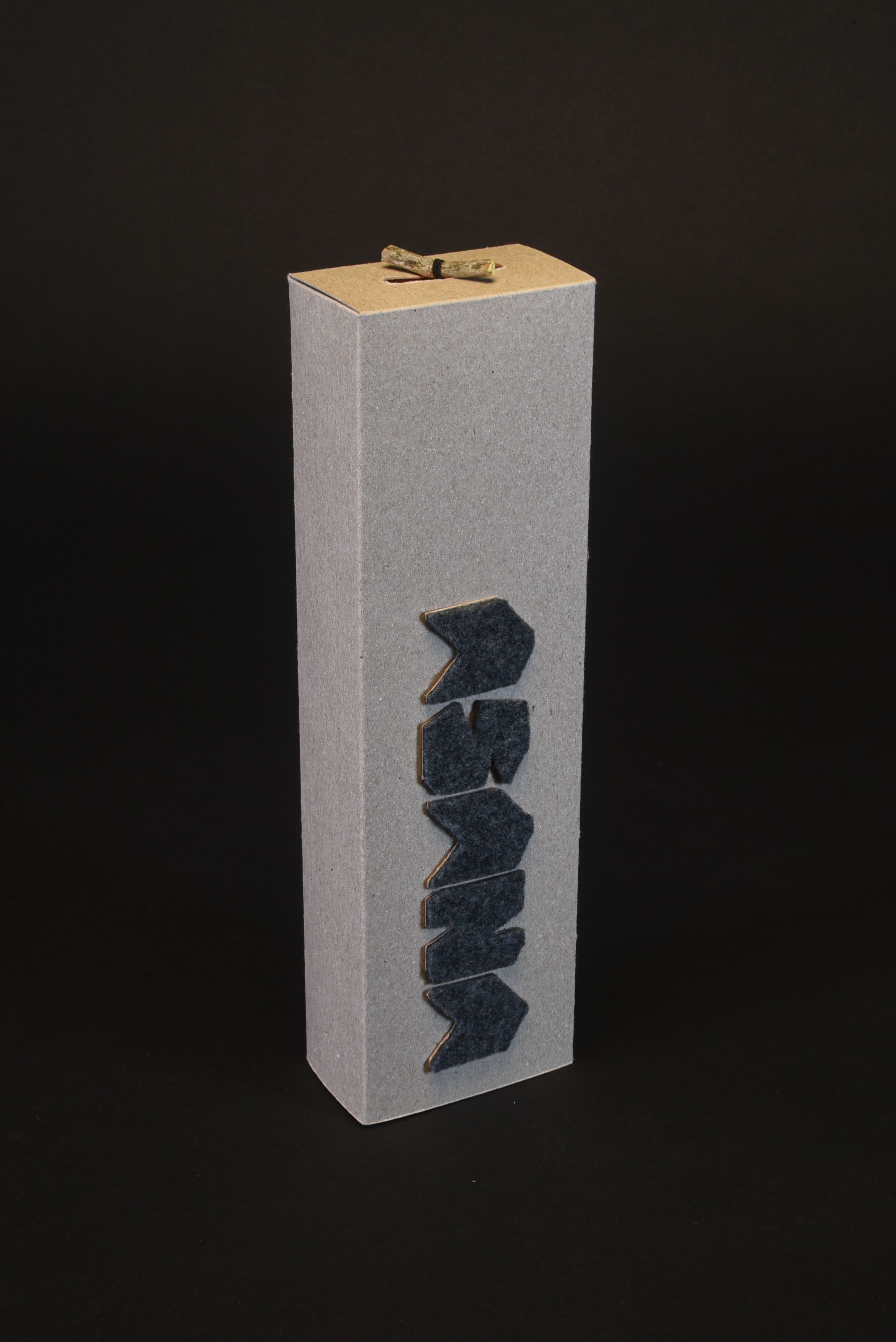 Materials - Organic blended felt, Cratemertal branch, High density cardstock, River clay fired in raku style.
