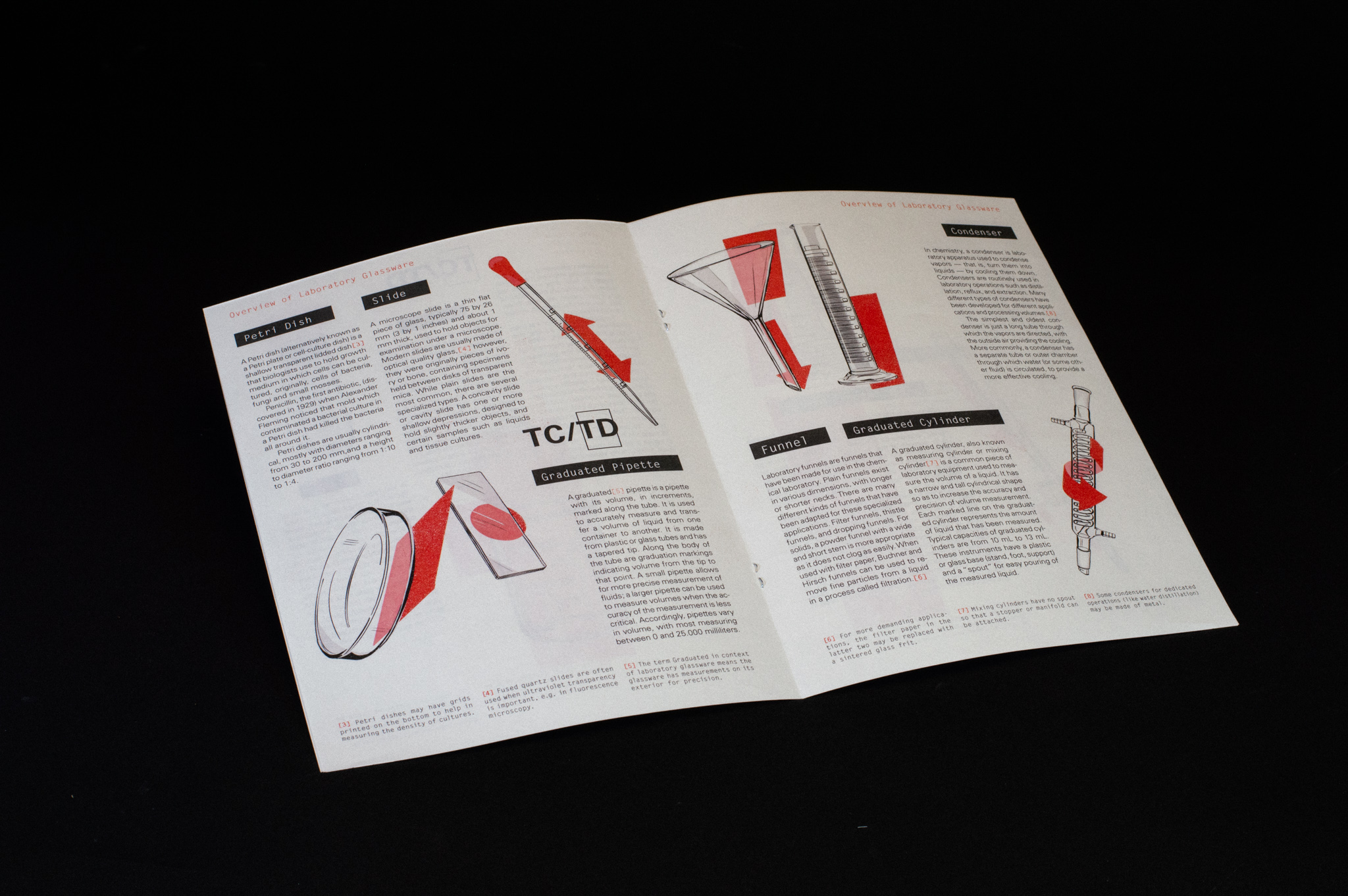 Lab Glassware incorporates illustration alongside exploration of grid structures. The topic of laboratory glasswares covers the history, functions and the different variety of uses for its distinct shapes. The illustration was done digitally using industrial design sketch elements such as thick flat arrows and colored planes calling to areas of interest. The field guides are separated into three booklets; manuscript, multi-column and deconstructed or superimposed.